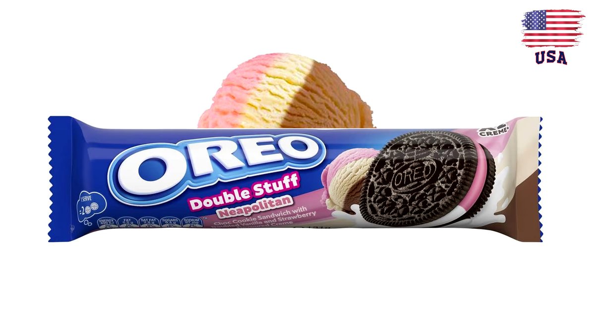 אוראו במילוי כפול של קרם בטעם גלידה תות וניל שוקו Oreo Neapolitan Double Stuf