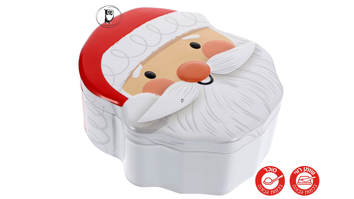 קופסת פח מעוצבת דמות סנטה – קופסת מתכת איכותית בצורת פניו של סנטה קלאוס, עם מכסה תלת־ממדי צבעוני ומאייר בסגנון חמים וילדותי. הקופסה מלאה בשוקולדים ועשויה מפח קשיח ועמיד, אידיאלית כמתנה לחג, לאחסון ממתקים, עוגיות, גומי לעיסה, הפתעות לילדים, תכשיטים קטנים או כל פריט קטן אחר.
