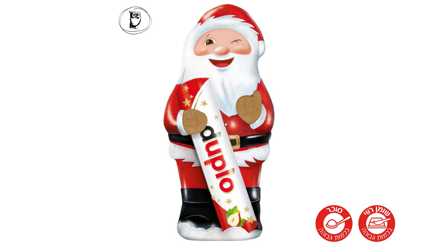 שוקולד סנטה של Duplo – דמות סנטה קלאוס חגיגית בעיצוב צבעוני ושמח, עשויה שוקולד חלב איכותי במילוי קרם אגוזי לוז. חטיף שוקולדי במרקם נימוח עם טעם אגוזי עשיר, מושלם כמתנה או כפינוק עונתי בעונת החגים.