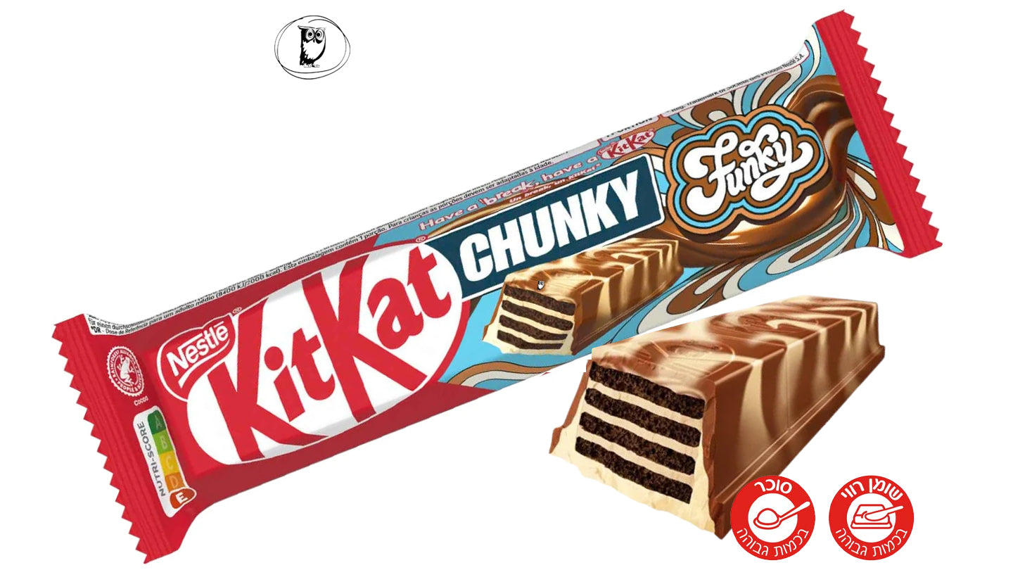 חטיף KitKat Chunky Funky הוא גרסה מיוחדת של קיטקט המשלבת שכבות וופל פריך עם קרם בטעמים מיוחדים וציפוי שוקולד חלב עשיר. החטיף מציע חוויית מרקם קראנצ’ית עם מילוי קרמי מתוק המעניק טוויסט חדש לחטיף הקיטקט הקלאסי. גרסת Chunky גדולה ועבה יותר מהקיטקט הרגיל ולכן מספקת ביס עשיר ומשביע יותר לחובבי שוקולד ווופל.