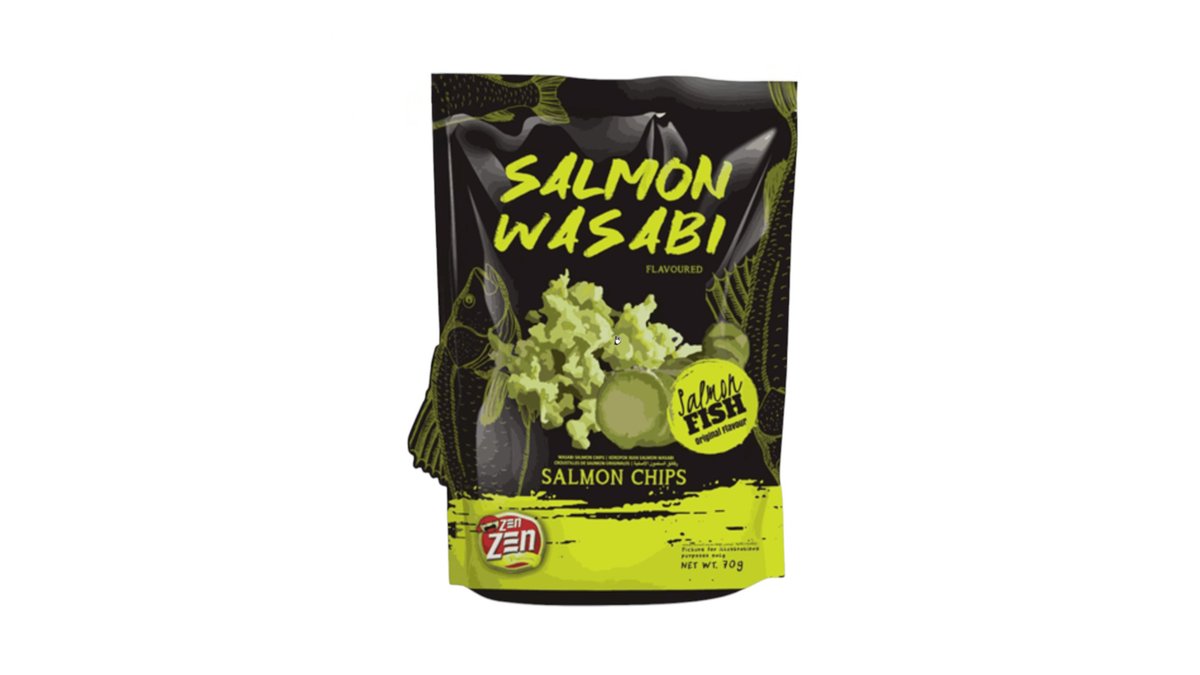 חטיף צ'יפס סלמון בטעם וואסבי מבית Zen Zen – פריכיות דקות ועשירות בחלבון עשויות מבשר סלמון, עם חריפות מעוררת של וואסבי. מתאים כנשנוש ייחודי ואקזוטי.