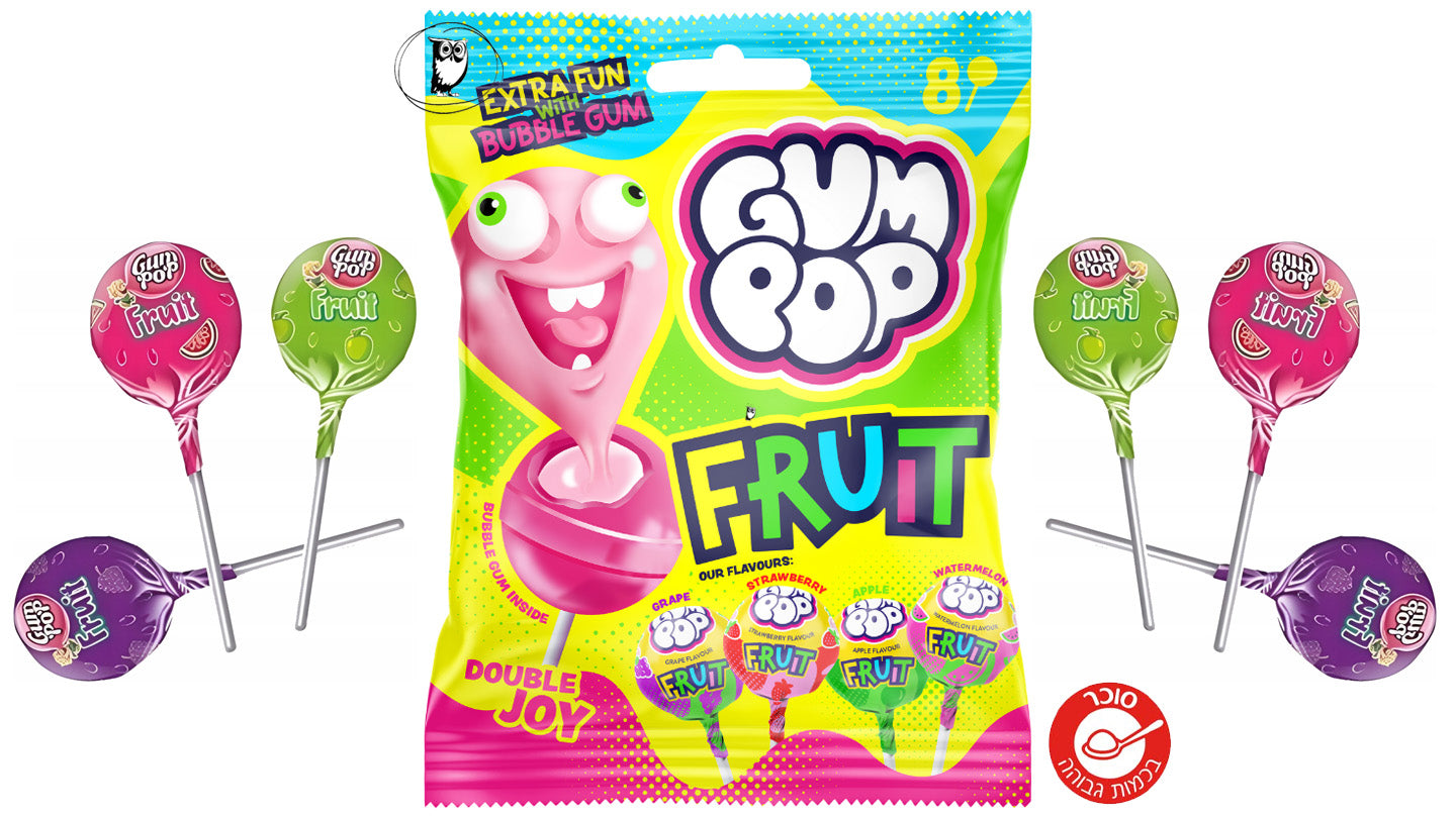 GUM POP FRUIT – חבילת סוכריות על מקל בטעמי פירות עם מסטיק באמצע, באריזה צבעונית וכיפית המתאימה לילדים ולמבוגרים אוהבי מתוק. הסדרה מציעה חוויית "Double Joy" – גם סוכרייה קשיחה מתוקה מבחוץ וגם מסטיק רך ומפתיע במרכז. הטעמים מגוונים וכוללים תות, ענבים, תפוח ואבטיח – כל טעם עטוף בנפרד ומסומן בצבעו, מה שמאפשר לטרוף רק את הטעמים שאתם אוהבים או לשלב כמה יחד. המוצר אידיאלי למסיבות, הפתעות, משלוחי מנות, דליי ממתקים והגשה צבעונית לאירועים.
