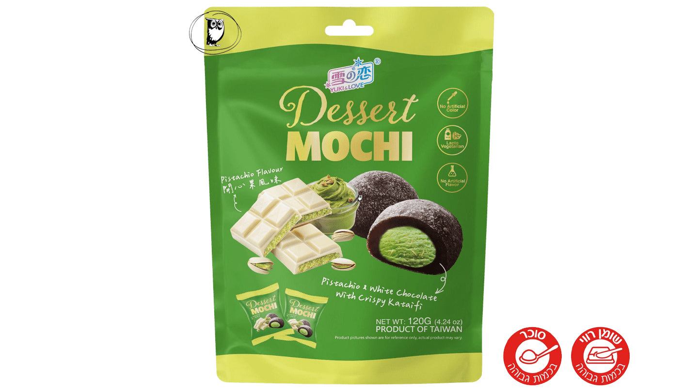 מוצ׳י יפני רך במילוי קרמי עשיר של פיסטוק ושוקולד לבן. המרקם האלסטי של שכבת האורז הדביק עוטף את המילוי המתוק-אגוזי, ומעניק חוויית קינוח עדינה ומיוחדת בסגנון יפני אותנטי. מתאים לקינוח אישי קר, כתוספת לצד גלידה או פשוט כנשנוש יוקרתי לאחר הארוחה.