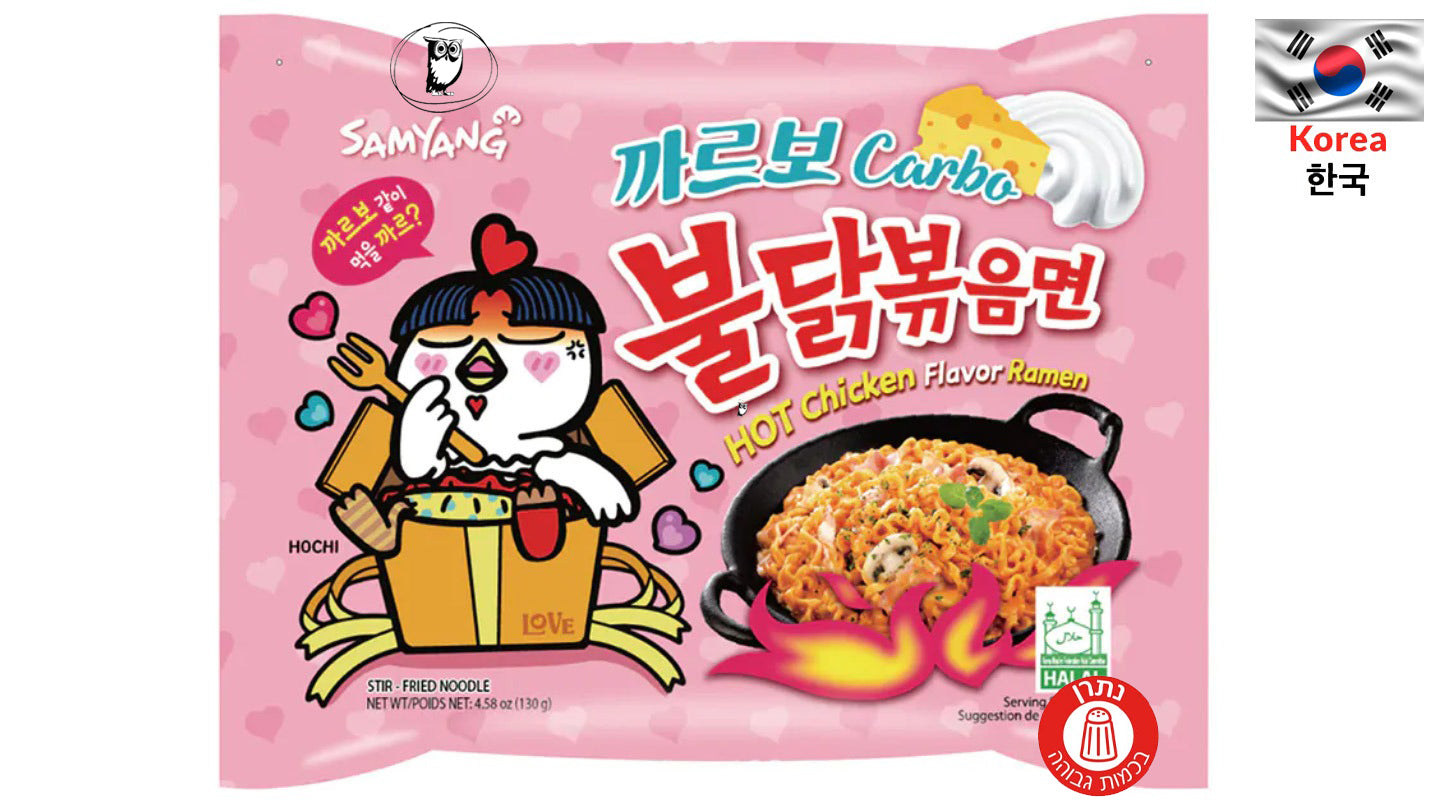 נודלס חריף-קרמי בסגנון “בולדאק” האגדי של Samyang, עם טוויסט של רוטב קרבונרה עשיר, גבינתי וקטיפתי. השילוב בין חריפות העוף המפורסמת של סדרת Buldak לבין מרקם קרמי ברוטב גבינה יוצר מנה ממכרת, מתוקה-חריפה, בעלת אופי צעיר וצבעוני – ממש כמו הקמע “הוצ’י” שעל האריזה. מתאים להכנה מהירה בתיבול אינטנסיבי, לאוהבי ראמן קוריאני בטעמים מיוחדים.