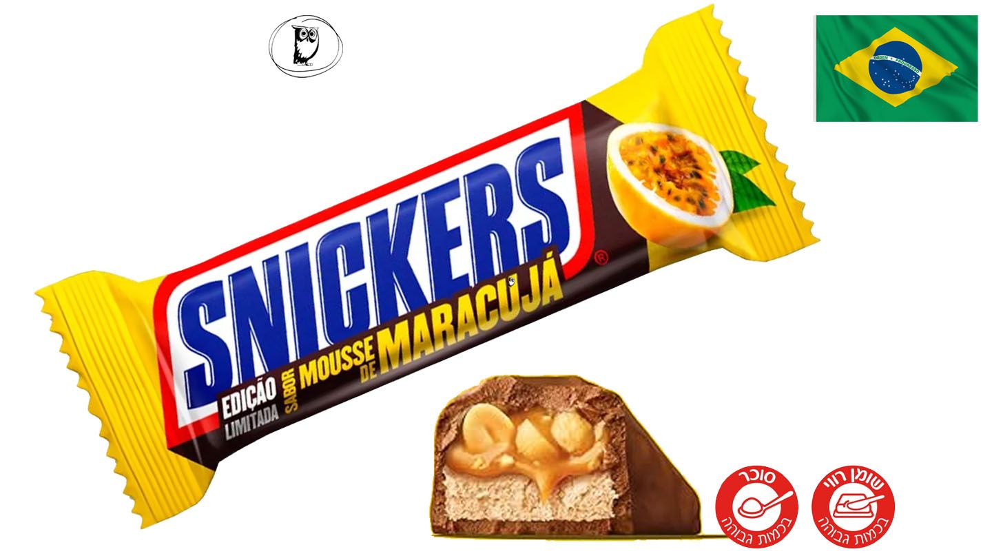 Snickers Mousse de Maracujá הוא חטיף סניקרס במהדורה מוגבלת מברזיל, המבוסס על אחד הקינוחים הפופולריים ביותר במדינה – מוס פסיפלורה (מרקוג׳ה). החטיף משלב טעם טרופי ורענן של פסיפלורה עם המבנה הקלאסי של סניקרס: קרמל עשיר ונוזלי, בוטנים קלויים שמוסיפים קריספיות, ונוגט עדין בטעם פסיפלורה שמעניק חמיצות-מתיקות מרעננת. הכול עטוף בשוקולד חלב חלק שמאזן את הטעמים ויוצר חוויה אקזוטית, מפנקת וייחודית לחובבי טעמים טרופיים.