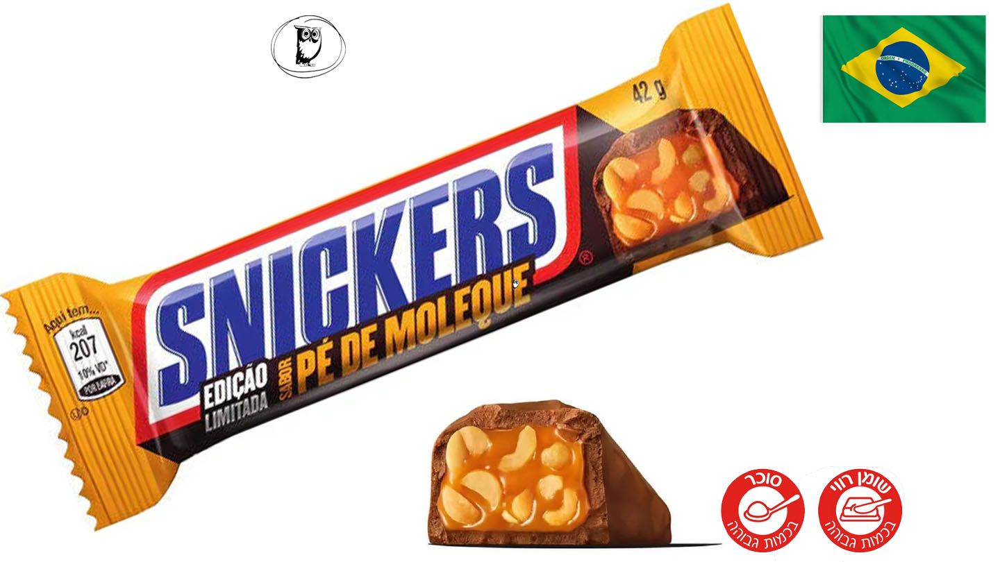 Snickers Pé de Moleque הוא חטיף סניקרס במהדורה מוגבלת מברזיל, בטעם שמבוסס על אחד הממתקים המסורתיים והאהובים במדינה – Pé de Moleque, ממתק בוטנים וקרמל קשיח בעל טעם עמוק ומתוק. החטיף משלב בין המרקם הקלאסי של סניקרס לבין שכבת קרמל עשירה וחתיכות גדולות של בוטנים, שמעניקות קריספיות וטעם אגוזי חזק יותר מהגרסה הרגילה. כל זה עטוף בשוקולד חלב ברזילאי, שיוצר חוויה מתוקה, עשירה ומלאה בניחוח אוטנטי של קינוח מקומי.
