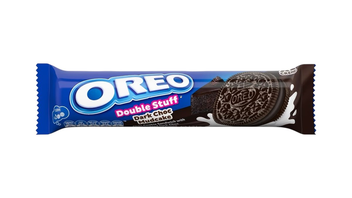 עוגיות Oreo Double Stuff Dark Choc Mudcake – עוגיות סנדוויץ' של אוריאו עם מילוי כפול בטעם "עוגת בוץ שוקולד מריר", עשיר ועמוק בטעם שוקולד.