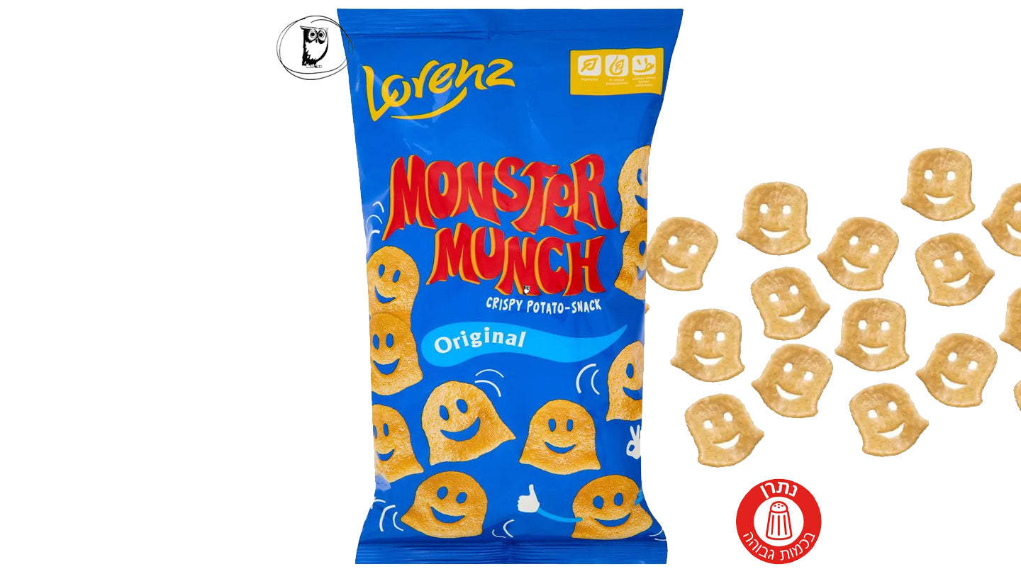 Monster Munch Original של Lorenz הוא חטיף תפוחי אדמה פריך ואייקוני שמוכר בזכות הצורה המשעשעת של “מפלצות מחייכות”. החטיף מיוצר מתערובת תפוחי אדמה ודגנים, מטוגן לקבלת מרקם אוורירי וקריספי במיוחד ומתובל בתיבול עדין ומלוח שהופך אותו לנשנוש ממכר. הצורה הייחודית והקראנצ’יות הקלה הופכים אותו לחטיף פופולרי בקרב ילדים ומבוגרים כאחד – מושלם לנשנוש לצד משקה, לצפייה בסרט או לשיתוף.