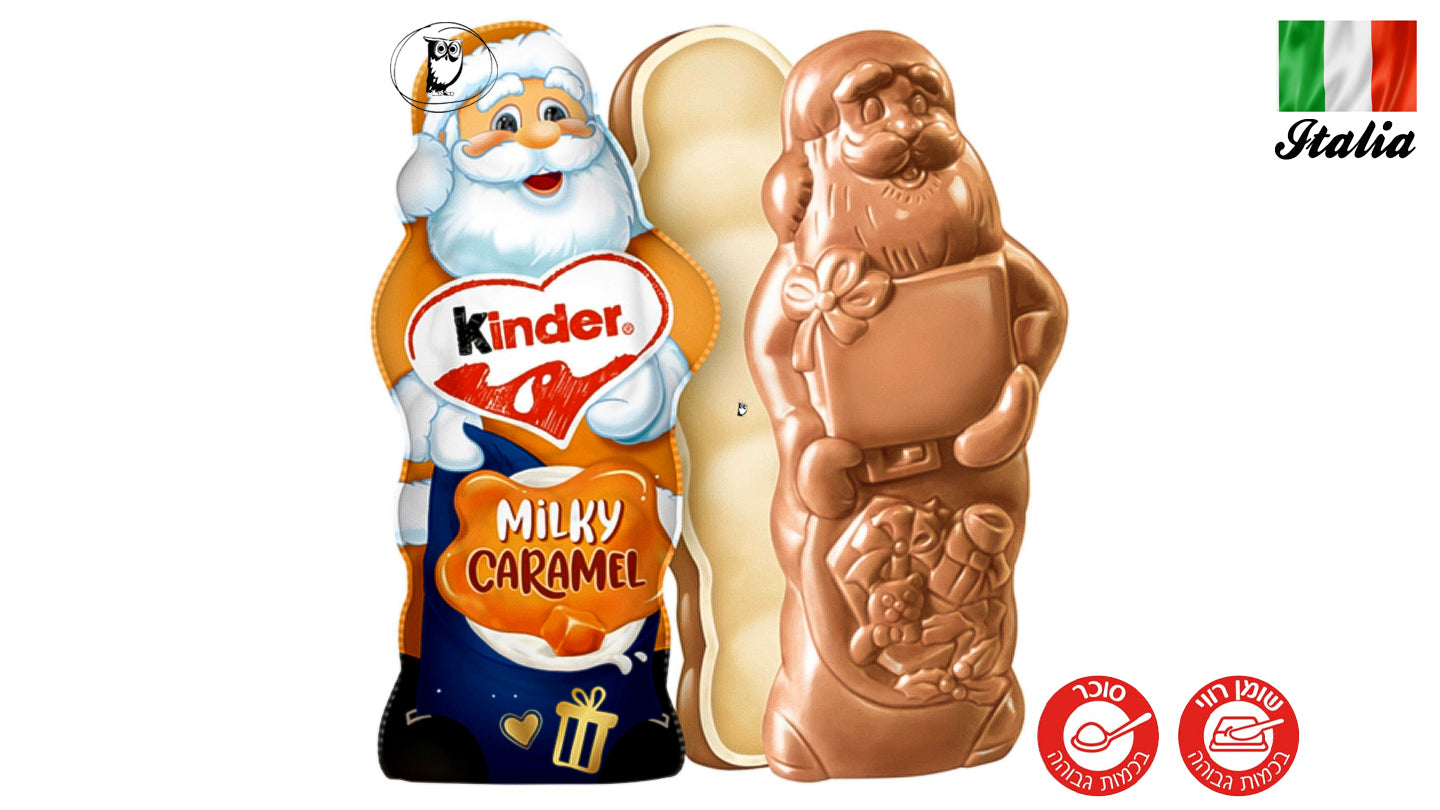 קינדר Milky Caramel – דמות שוקולד חגיגית של סנטה במילוי קרמל חלבי. המוצר משלב את טעמו המוכר של שוקולד החלב של Kinder עם שכבת קרמל רכה ונימוחה, היוצרת ביס עשיר ומתוק במיוחד. זהו מוצר עונתי שמגיע מאיטליה, מיועד כמתנה חגיגית, כממתק חג מולד קלאסי או כפינוק אישי למי שאוהב שוקולד קרמי ומתיקות מודגשת. השוקולד מגיע בעיצוב תלת־ממדי של סנטה, מה שהופך אותו גם לאסתטי וגם מפתיע כשפותחים.